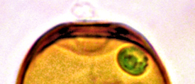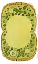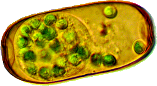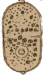 Dieses Bild stellt ein Individuum dar, wie ich es einige Male, aber sehr selten beobachtet habe. In der Mitte ist die Schale durch eine feine Rille eingeengt, die sich als sehr schwache Linie sichtbar an der Oberfläche fortsetzt und die Schale in zwei Teile teilt. Bei dem hier abgebildeten Individuum sahen wir die Zoochlorellen jeweils in einer Hälfte gruppiert, wobei auch hier noch zwei helle Flecken vorhanden waren.