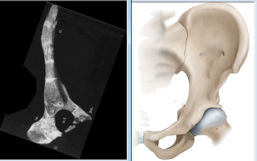 (pubis) und die frühere Oberschenkelpfanne, hinten links das Darmbein