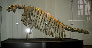 | Incomplete, composite, mounted skeleton (if complete ca 7 meter long) 1 skull, 1 sternum, 1 scapula, left and right humerus+radius+ulna, 35 vertebrae (several processes damaged), 18 pairs of ribs. Skull bought 1891 from Otto Herz, Skeleton bought 1903, confiscated 1945 and brought to Moscow, returned by USSR in 1982. |