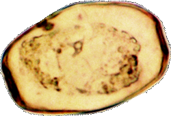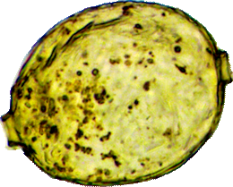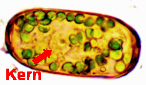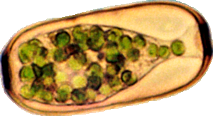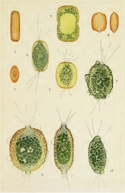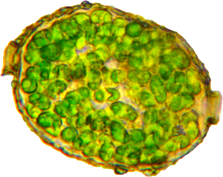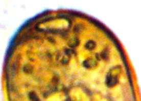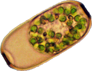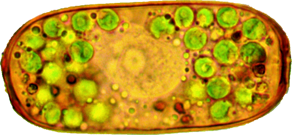 Dieses Bild stellt ein Individuum dar, wie ich es einige Male, aber sehr selten beobachtet habe. In der Mitte ist die Schale durch eine feine Rille eingeengt, die sich als sehr schwache Linie sichtbar an der Oberfläche fortsetzt und die Schale in zwei Teile teilt. Bei dem hier abgebildeten Individuum sahen wir die Zoochlorellen jeweils in einer Hälfte gruppiert, wobei auch hier noch zwei helle Flecken vorhanden waren.
