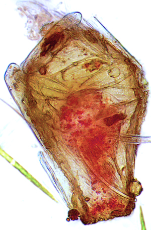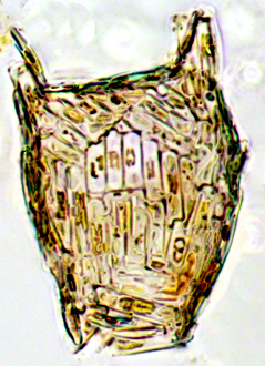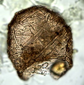Altersdunkles, leeres Exemplar aus dem Ibmer Moor, Größenverhältnis ist mit 126/83 µm arttypisch ca. 1,5:1.