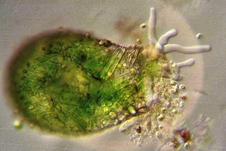Difflugia rubescens und (hier) Pseudonebela africana ernähren sich von Grünalgen, bevorzugt saugen sie Closterien aus. Im zweiten Foto vergewissert sich eine Pseudopodie, dass das Algengehäuse leer ist.