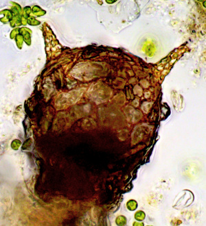Zusammen mit zahlreichen kugeligen Exemplaren fand ich im Ibmer Moor Exemplare mit einigen kleineren Hörnern. Leidy nannte diese Variante Difflugia urceolata var. olla.