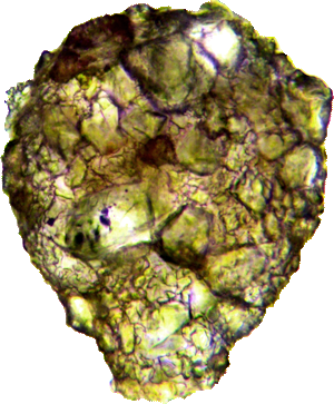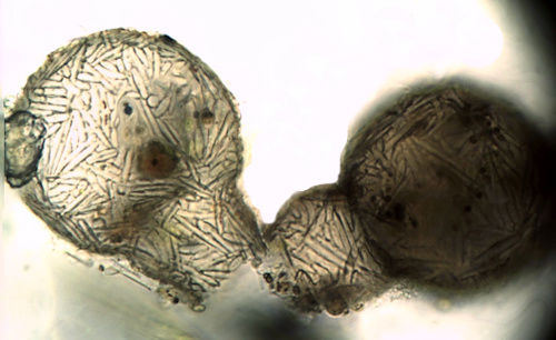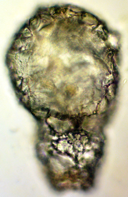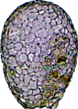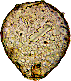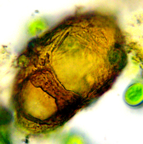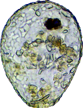 Mit zwei nicht identifizierten ca. 30 µm großen Xenosomen (Eunotia Diatomeen?).
