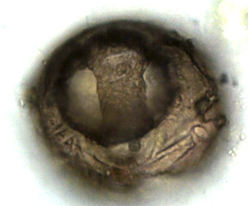 Oben: Durch die Mundöffnung zu erkennen: Der Steg zwischen zwei Öffnungen in der Scheidewand, der das Exemplar als Pontigulasia rhumbleri identifiziert.