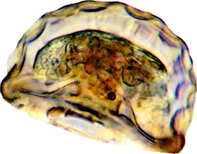 Aussen die Struktur der Schale, innen der Plasmaleib und die Position des Pseudostom, 83 µm.