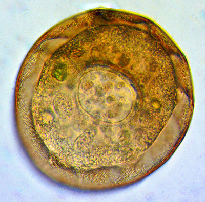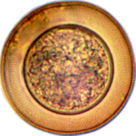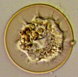 Enzystierte Arcella cf. hemisphaerica, 53 µm Durchmesser, Zyste 34 µm. Balksee-Moor.