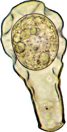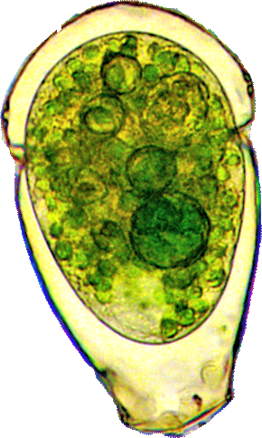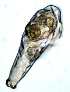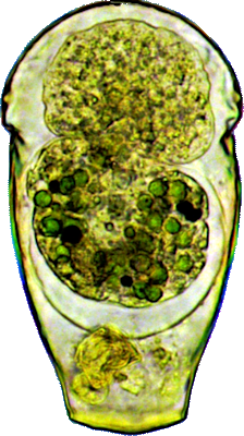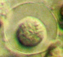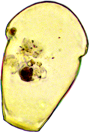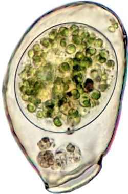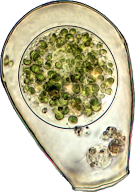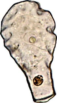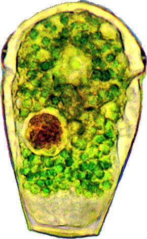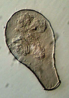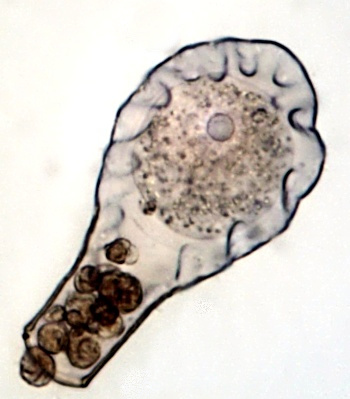 Der Plasmaleib füllt die Schale nicht aus, er ist mit sogenannten Epipodien darin aufgehängt, mittig oben der Zellkern (schief beleuchtet).