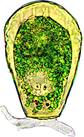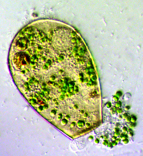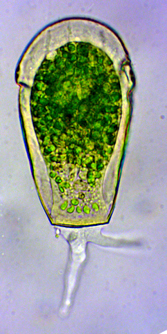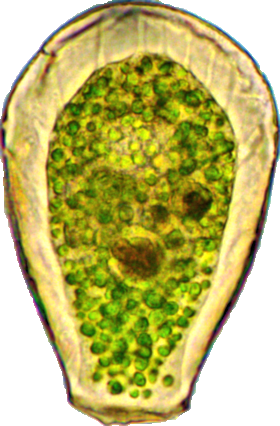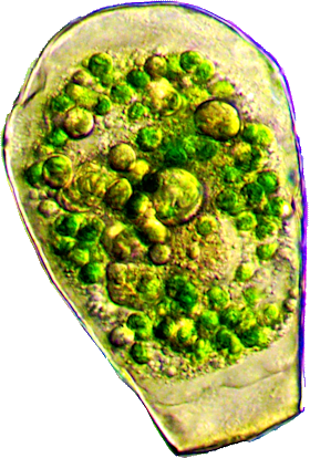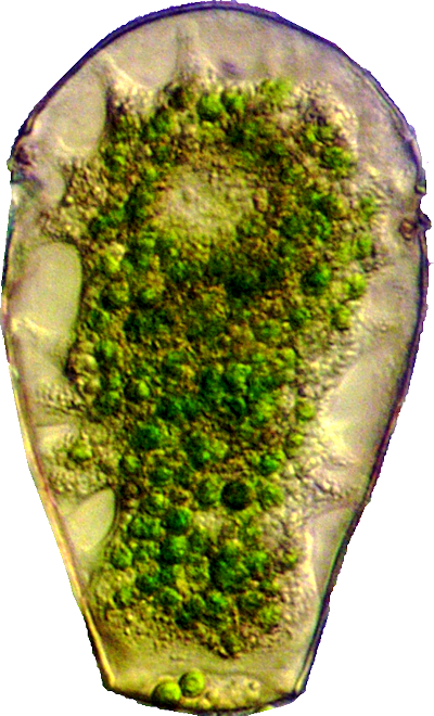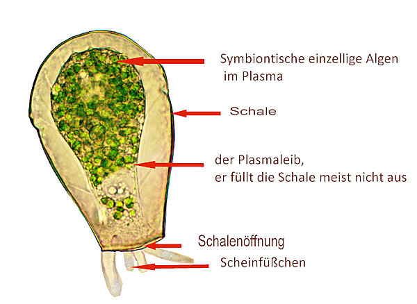Der Schaleninhalt wird durch fünf bis acht fadenförmige, ektoplasmatische Zellausläufer (Epipodien) an der Schaleninnenfläche befestigt. Symbiontische Algen (Zoochlorellen) sind in der Zelle immer vorhanden. Lebhafte lappenförmige Pseudopodien (Lobopodien) dienen der Fortbewegung und Nahrungsaufnahme. Die kontraktilen Vakuolen finden sich im oberen Viertel.