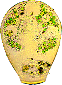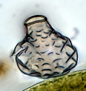 [Keine andere Schalenamöbe hat mich so durch ihre Schönheit beeindruckt wie diese. Wegen ihrer Zartheit und Transparenz, ihrer hellen Farben und der Form, und wie sie sich durch Torfmoos, Zier- und Kieselalgen bewegt. Ich hatte dabei die Vorstellung eines Schmetterlings, der zwischen Blüten herumschwebt.