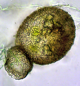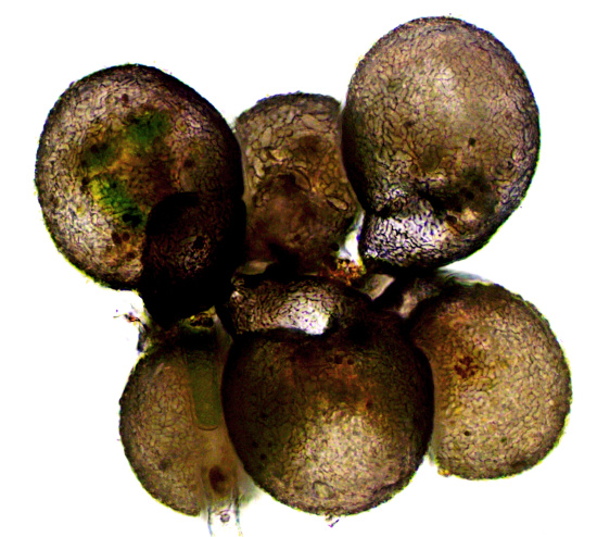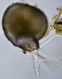 Exemplar mit dicken Idiosomen, ebenfalls aus dem Birkenbruch am Balksee, schief beleuchtet, oben mit Stackingartifakten.