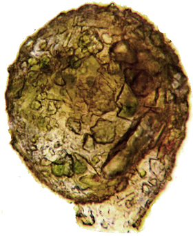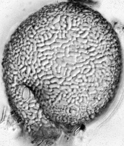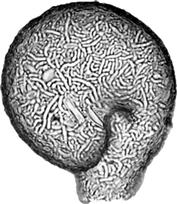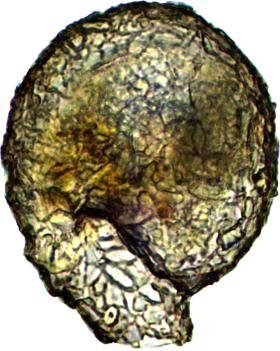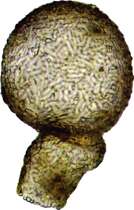 Kugelförmiger Körper, durch eine Rille abgesetzter, schräg angesetzter langer Hals, spiralis-ähnliche Idiosomen.