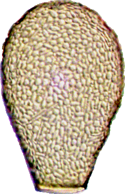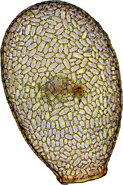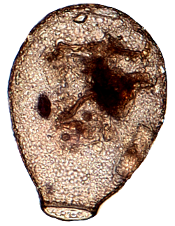Diese Aufnahme bei schiefer Beleuchtung zeigt eine 117 µm hohe Nebela aus der tincta/collaris-Gruppe (vermutlich N. penardiana), aus feuchtem Torfmoos.