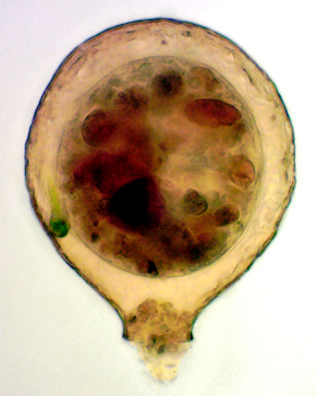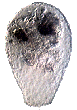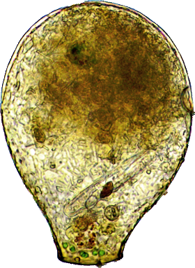 Nebela pechorensis, 104 µm, schiefe Beleuchtung, Zellkern rechts unten, vermutlich zwei kontraktile Vakuolen. Artkennzeichen gerade Öffnung