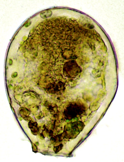 Mit runden Euglypha-Schalen als Xenosomen.