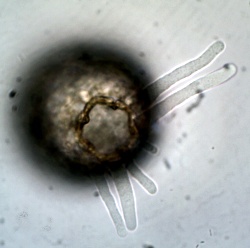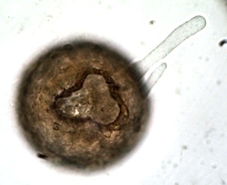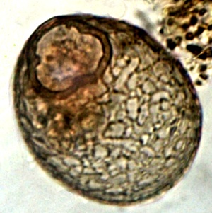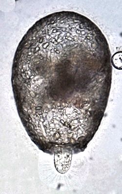 Diese 125 µm große Netzelia versuchte, ein unbekanntes ca 35 µm großes Opfer zu fressen.