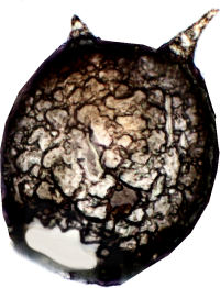 170 µm hohe (ohne Stachel gemessen) Netzelia corona mit zwei Dornen . Die Regel sind 4-6 Dornen, aber in meiner derzeitigen Probe gibt es nur 2-stachlige Exemplare.
