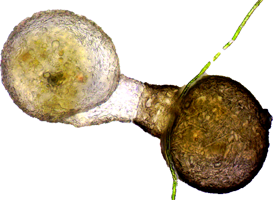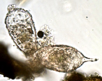 Zur Teilung tritt aus der Öffnung der Mutterzelle eine Knospe hervor. Diese Knospe, eine besondere Form eines Pseudopodiums, erreicht bald die Form und Größe der Mutterzelle. (Eigentlich dürfte ich nicht von Mutter und Tochter sprechen. Beide Zellen sind neu. Das Exemplar. welches im alten Gehäuse bleibt, nenne ich Mutter.)