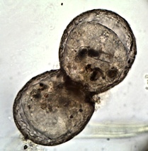 Erst nach Fertigstellung des neuen Gehäuses teilt sich der Zellkern, einer davon wandert in die bereits fertige neue Zelle, und die beiden Einzelzellen trennen sich.